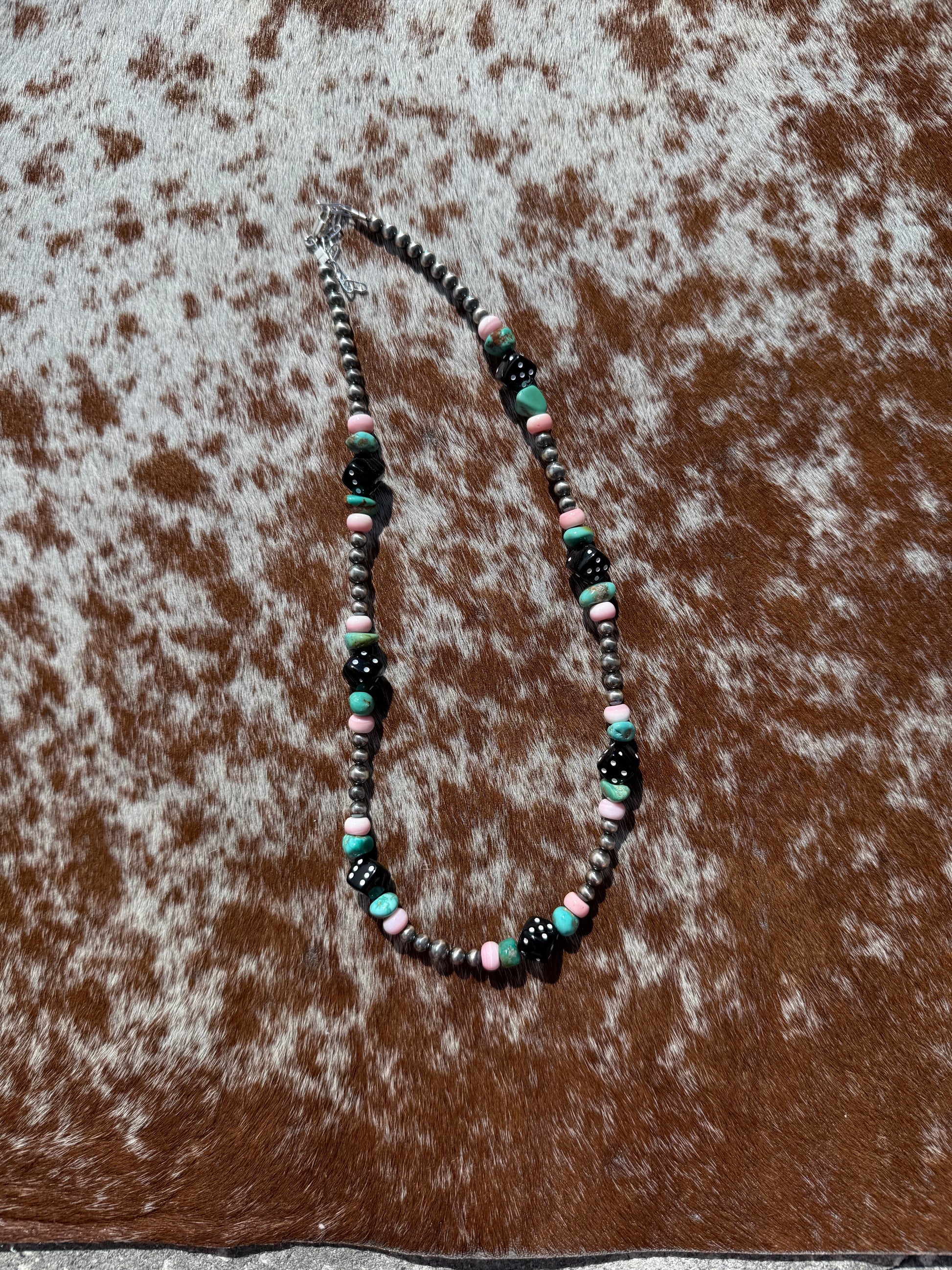 4mm and 5mm Navajo Pearl, Dice, Pink Conch, Number 8 Turquoise 16"
