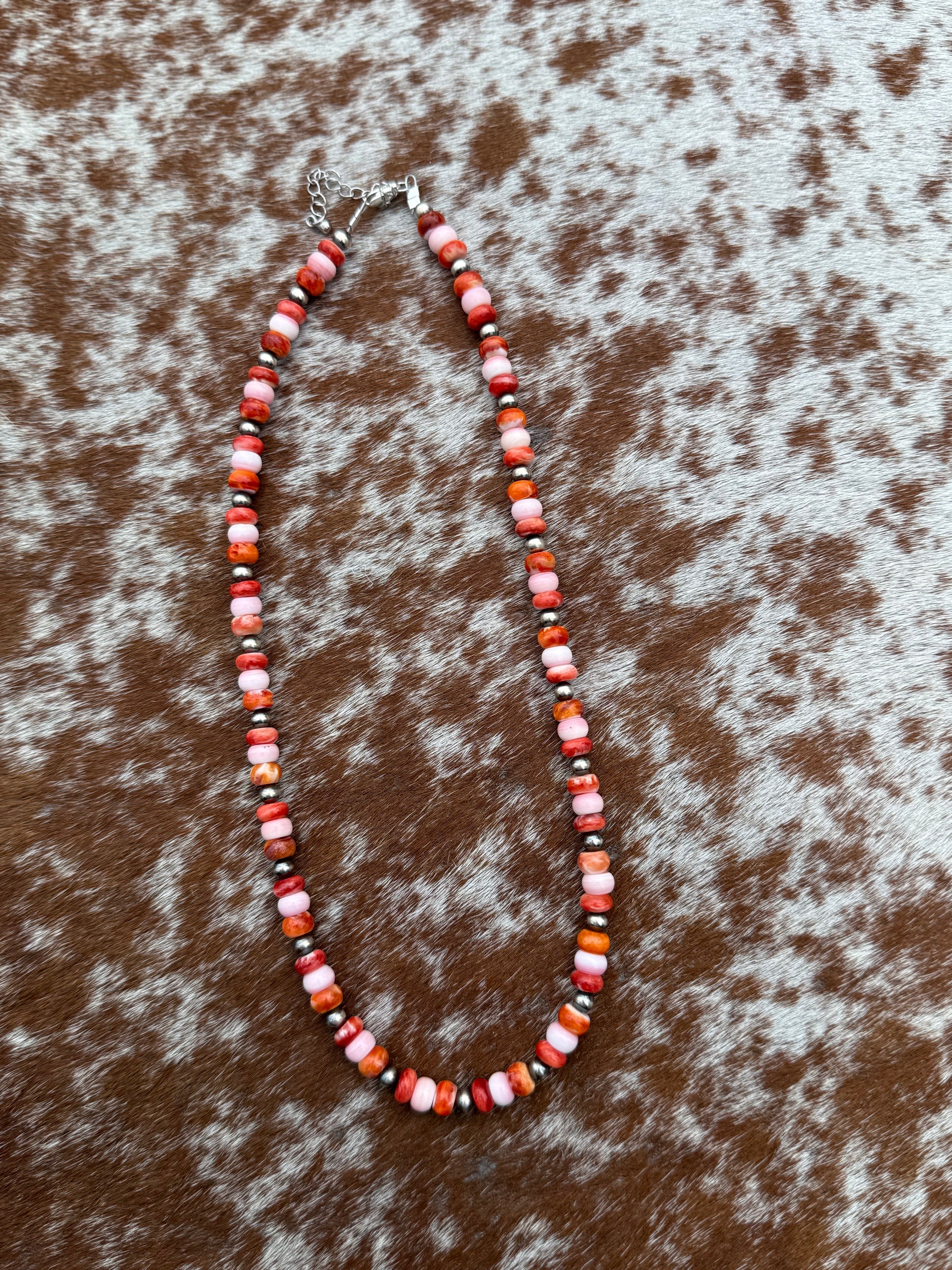 4mm navajo inspired pearls, red and orange spiny oyster, and pink conch